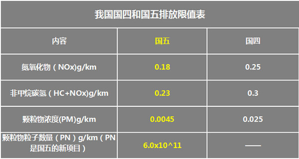 國(guó)五排放標(biāo)準(zhǔn)相比國(guó)四排放標(biāo)準(zhǔn),氮氧化物(NOx)排放降低了28%,碳?xì)浠衔锖偷趸铮℉C+NOx)總和指標(biāo)降低了23%,而對(duì)于柴油車的顆粒物濃度(PM)降低了82%,還有新增的顆粒物粒子數(shù)量(PN)檢測(cè)也是沖著柴油車來(lái)的,PN標(biāo)準(zhǔn)只對(duì)柴油車檢測(cè)。