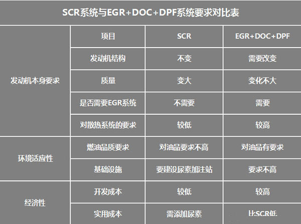 通過(guò)對(duì)比可發(fā)現(xiàn)SCR燃油經(jīng)濟(jì)性好,發(fā)動(dòng)機(jī)改動(dòng)小,低熱量對(duì)冷卻系統(tǒng)無(wú)要求,但是,SCR系統(tǒng)箱體處理尺寸和重量大,監(jiān)控系統(tǒng)復(fù)雜,需要增加尿素,時(shí)間長(zhǎng)了會(huì)產(chǎn)生結(jié)晶,整體成本提升,特別對(duì)輕卡來(lái)說(shuō)。