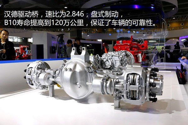 后橋?yàn)闈h德品牌驅(qū)動(dòng)橋,速比為2.846,制動(dòng)形式為盤式制動(dòng),剎車更加靈敏安全。另外該車的車橋B10壽命由60萬公里提高到120萬公里,保證了車輛的可靠性。