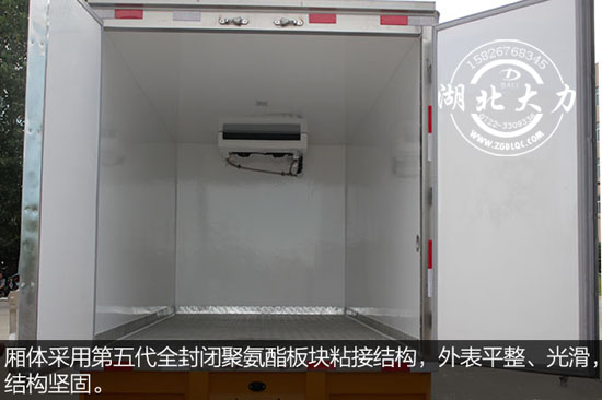 廂體厚度8厘米,內(nèi)外板材采用冷藏車專用玻璃鋼(可反射陽光),中間夾層為聚氨酯發(fā)泡隔熱材料(防火阻燃隔熱)真空復(fù)合三明治制板而成。底板為防滑鋁花紋板,廂內(nèi)帶有頂燈及防撞塊,設(shè)計貼心、用心。廂體后開門的門邊使用灰色膠條包邊處理,可以很好的防止冷氣外流。
