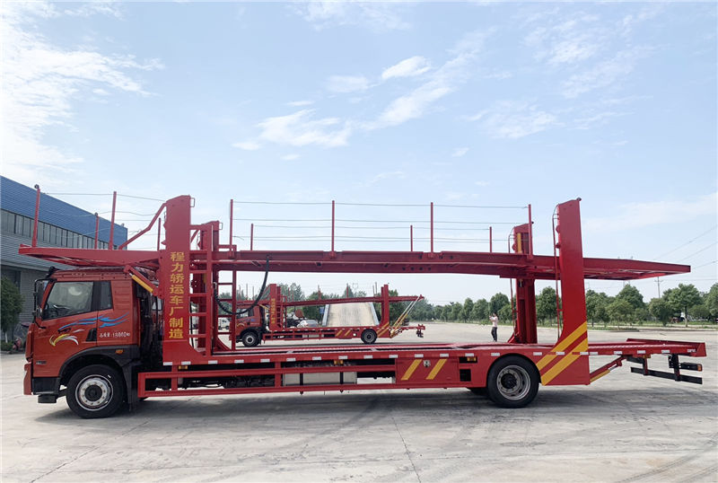 采用一汽解放的二類運輸車底盤,龍V2.0平頂半浮駕駛室,軸距7200,陜齒8檔變速箱,后橋435升級沖悍橋(速比4.444);錫柴六缸220馬力發(fā)動機(jī),295/60R22.5輪胎,空調(diào),空氣彈簧座椅,電動門窗,電動舉升,300L鋁合金油箱,中控鎖,ABS,行車記錄儀(GPS+北斗),自主氣驅(qū)系統(tǒng)。上裝配置:全車高配10支油缸,上板標(biāo)配凈長12米,下板凈長9.6米,下板板面離地高1米,上下板凈空間≥2米,國產(chǎn)液壓控制系統(tǒng),立柱為全低合金高強(qiáng)材料制作,其他材料為:Q235、Q345和HG70高強(qiáng)度國標(biāo)鋼材。